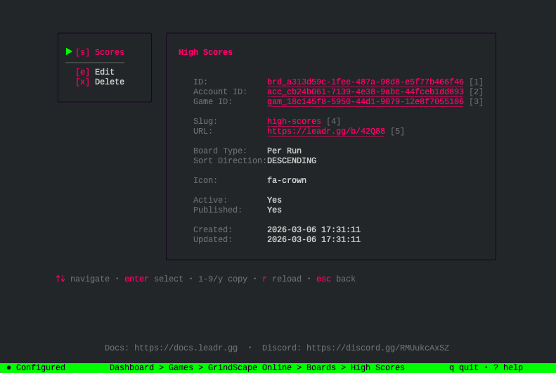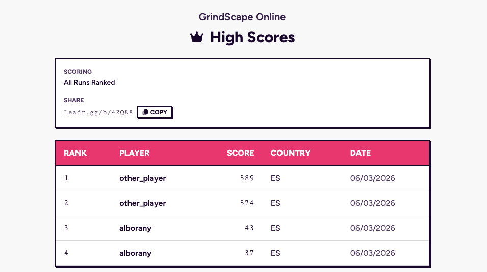 LEADR is free and open source. The quick start guide gets you from zero to a working leaderboard in a few minutes. The Grindscape source code is available on GitHub as a working reference for the full integration. If you run into anything, the LEADR Discord is always open.